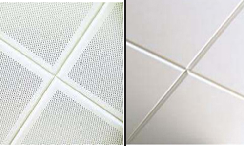 The term lay-in refers to tiles that have minimal tile face coverage by the supporting exposed grid as distinct from lay-on tiles where the face of the tile is fully visible. Lay-in tiles are used with exposed grid table usually 24/15mm wide although different grid table widths are available. (1)- Lay In Plain (2)- Lay In Perforated